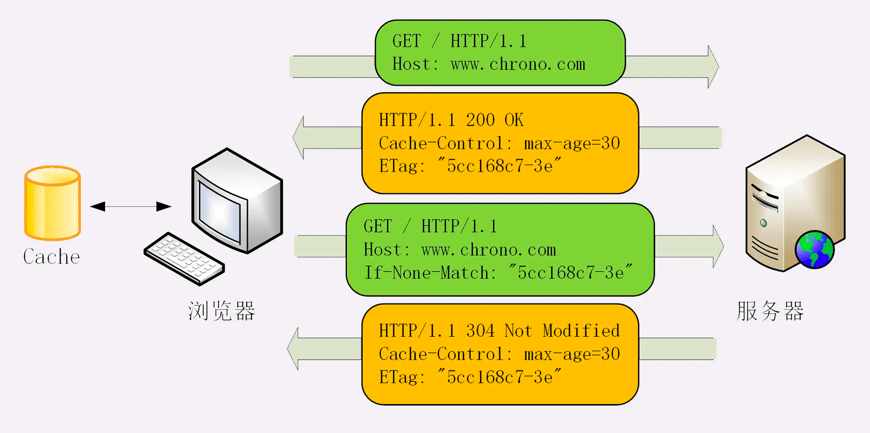 ETag 还有“强”“弱”之分。强 ETag 要求资源在字节级别必须完全相符,弱 ETag 在值前有个“W/”标记,只要求资源在语义上没有变化,但内部可能会有部分发生了改变(例如 HTML 里的标签顺序调整,或者多了几个空格)。