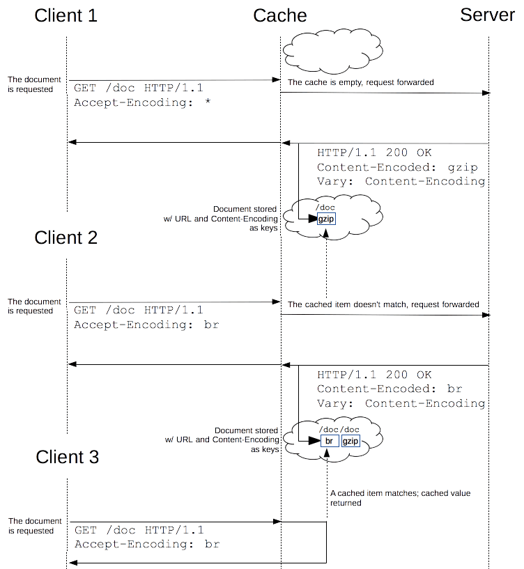 大多数浏览器都支持 vary 缓存验证,但要注意的是浏览器通常不会实现为同个 URL 存储多个变体的功能,只会为唯一 URL 做单一内容版本存储;而代理服务器通常可自定义实现对同个 URL 多个 vary 缓存。