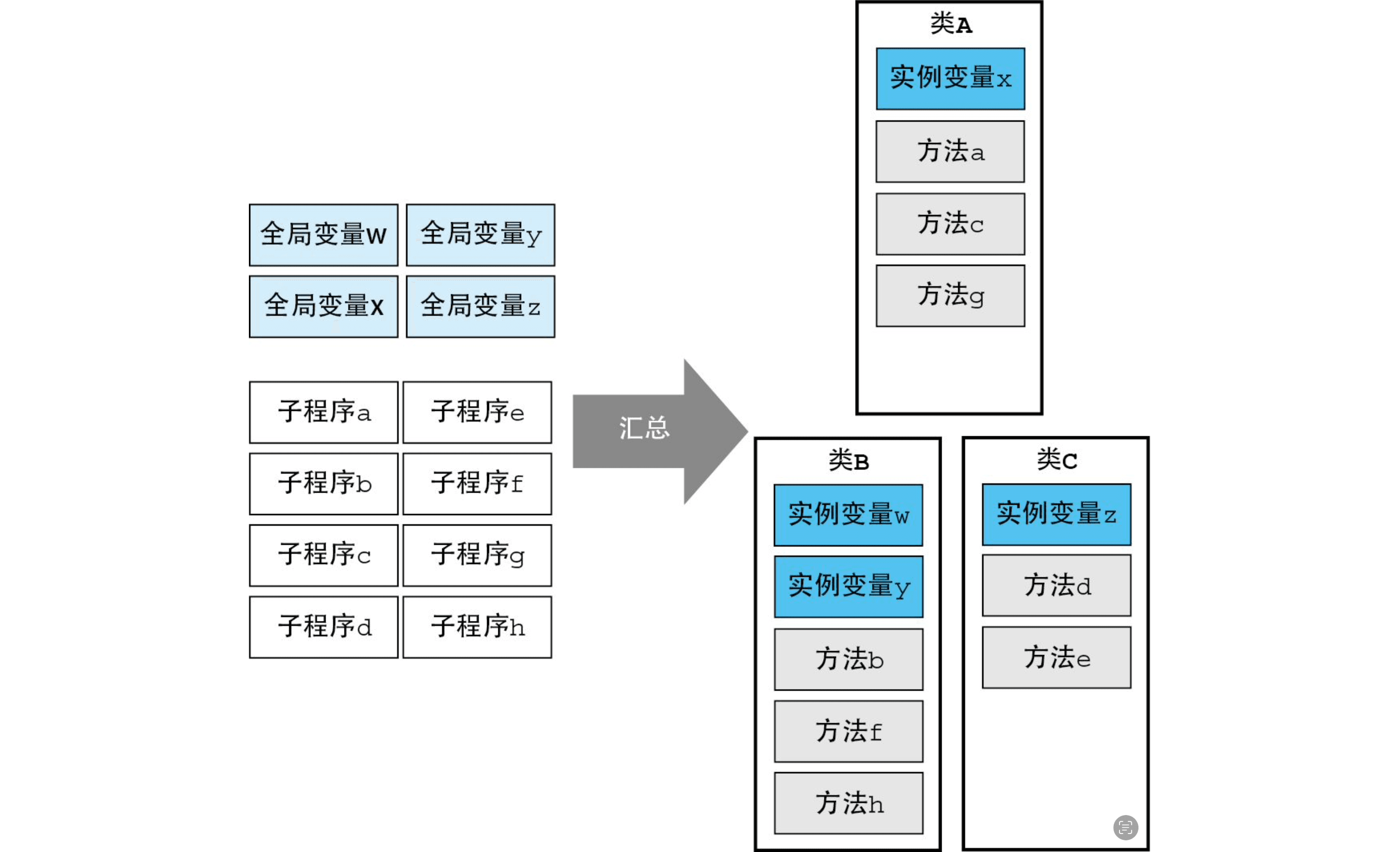 - 有了封装同时也有了模块化的能力,更好得解决了结构化编程下的全局变量、强依赖的问题,实例变量是存在期间长的局部变量或者限定访问范围的全局变量