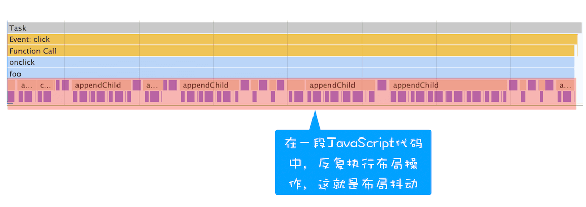 布局抖动,是指在一次 JavaScript 执行过程中,多次执行强制布局和抖动操作。如此频繁会大大影响当前函数的执行效率,从而阻塞其他渲染任务执行,降低帧率。
