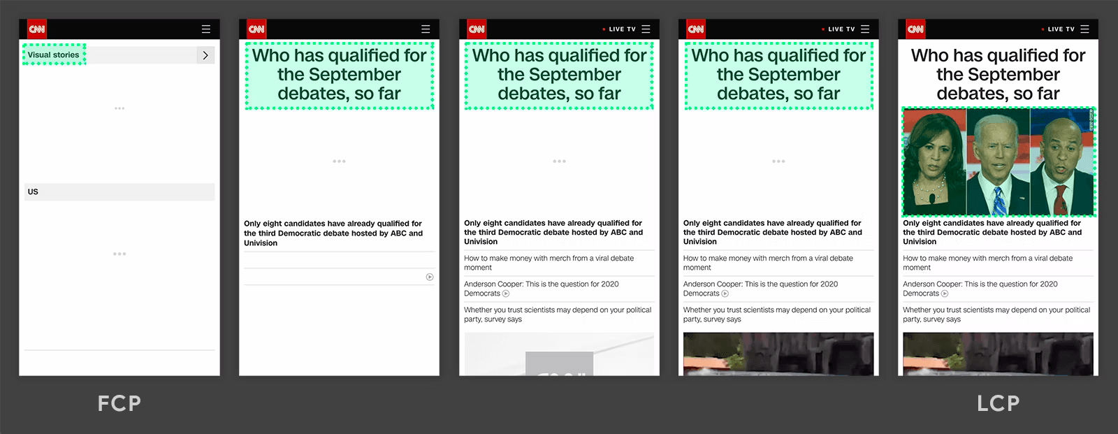 - Largest Contentful Paint 最大内容绘制 (LCP):视窗内最大的元素绘制的时间