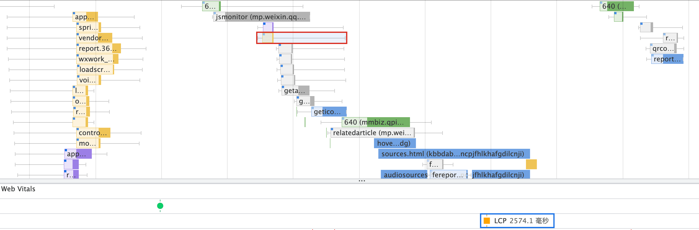 或者通过 DevTools Performance 面板观察 FP、FCP、LCP 或者自定义首屏指标之前发起的请求链去进行确认,在指标之前的请求大致可认为是关键资源: