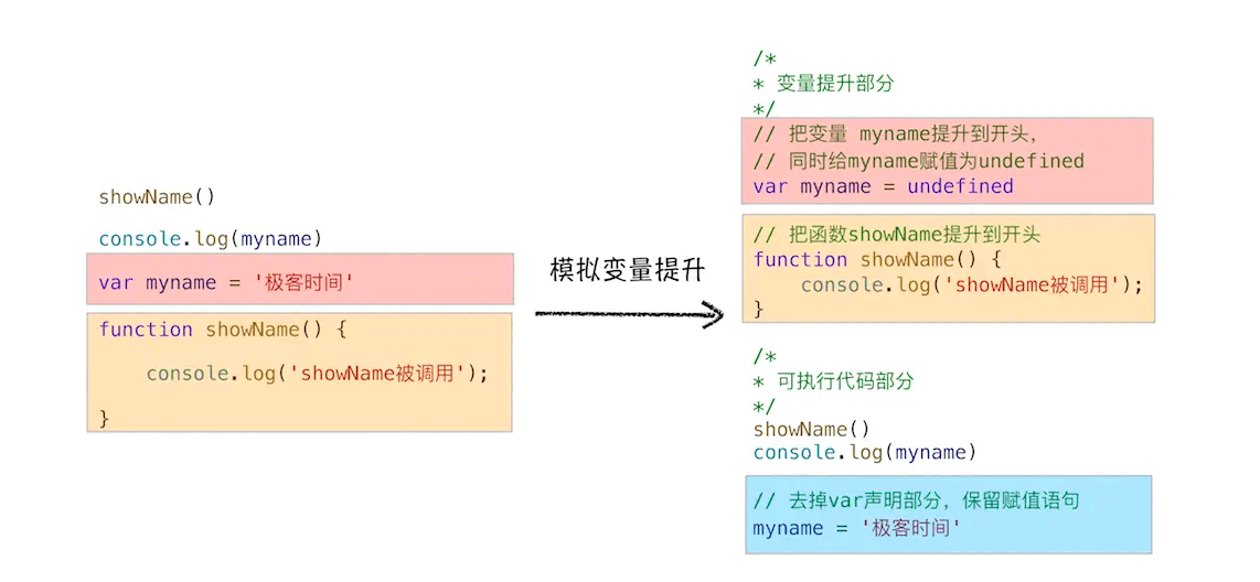 变量提升,发生在 JavaScript 代码编译阶段。实际上变量和函数声明在代码里的位置是不会改变的,而且是在编译阶段被 JavaScript 引擎放入内存中。一段 JavaScript 经过编译后,会生成两部分内容:执行上下文(Execution context)和可执行代码(会被编译为字节码)。