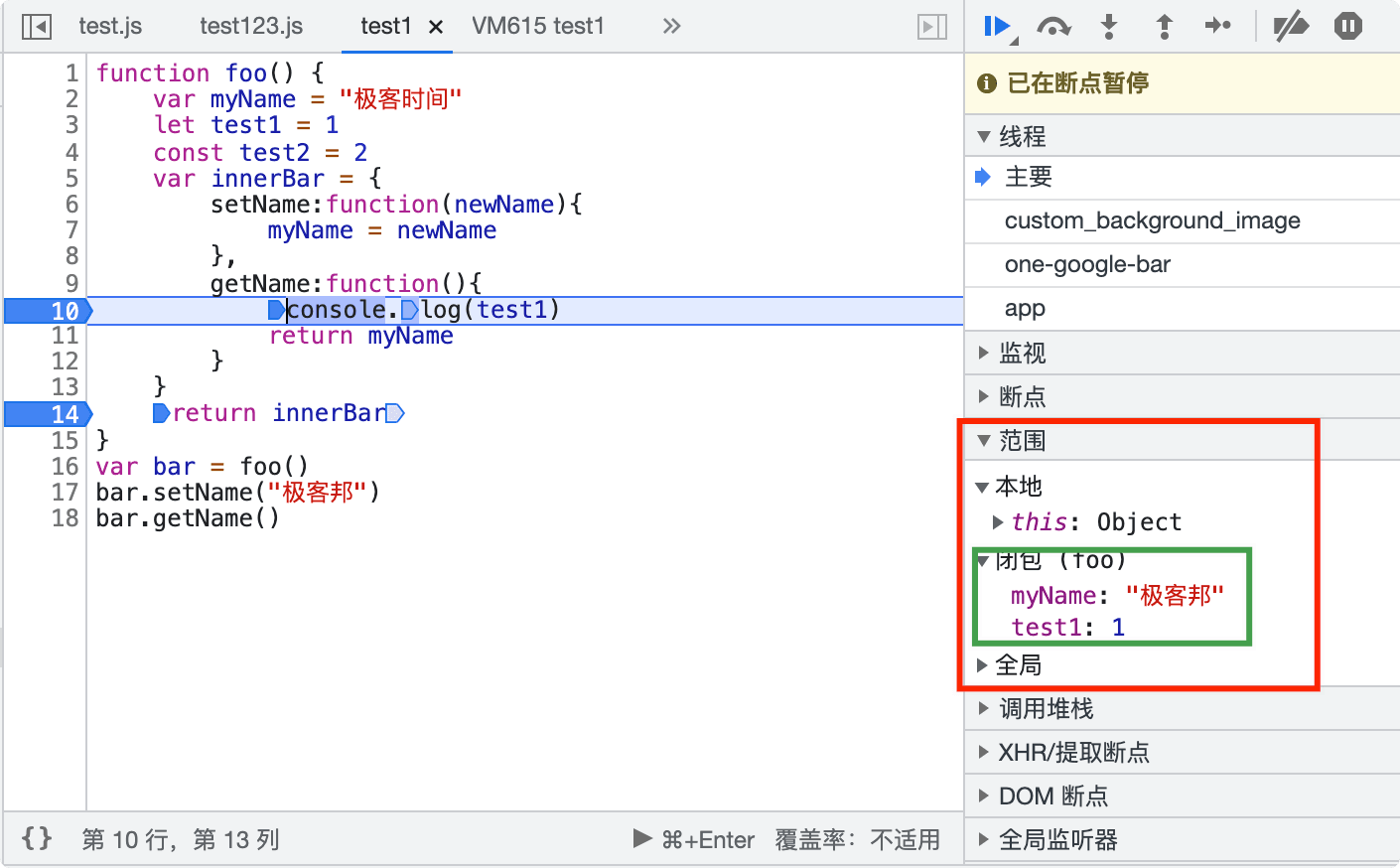 closure(foo)的对象(这是一个内部对象,JavaScript 是无法访问的),用来保存 myName 变量,closure(foo)保存在 setName 的作用域链属性[[scopes]]上。 - 接着继续扫描到 getName 方法时,发现该函数内部还引用变量 test1,于是 JavaScript 引擎又将 test1 添加到