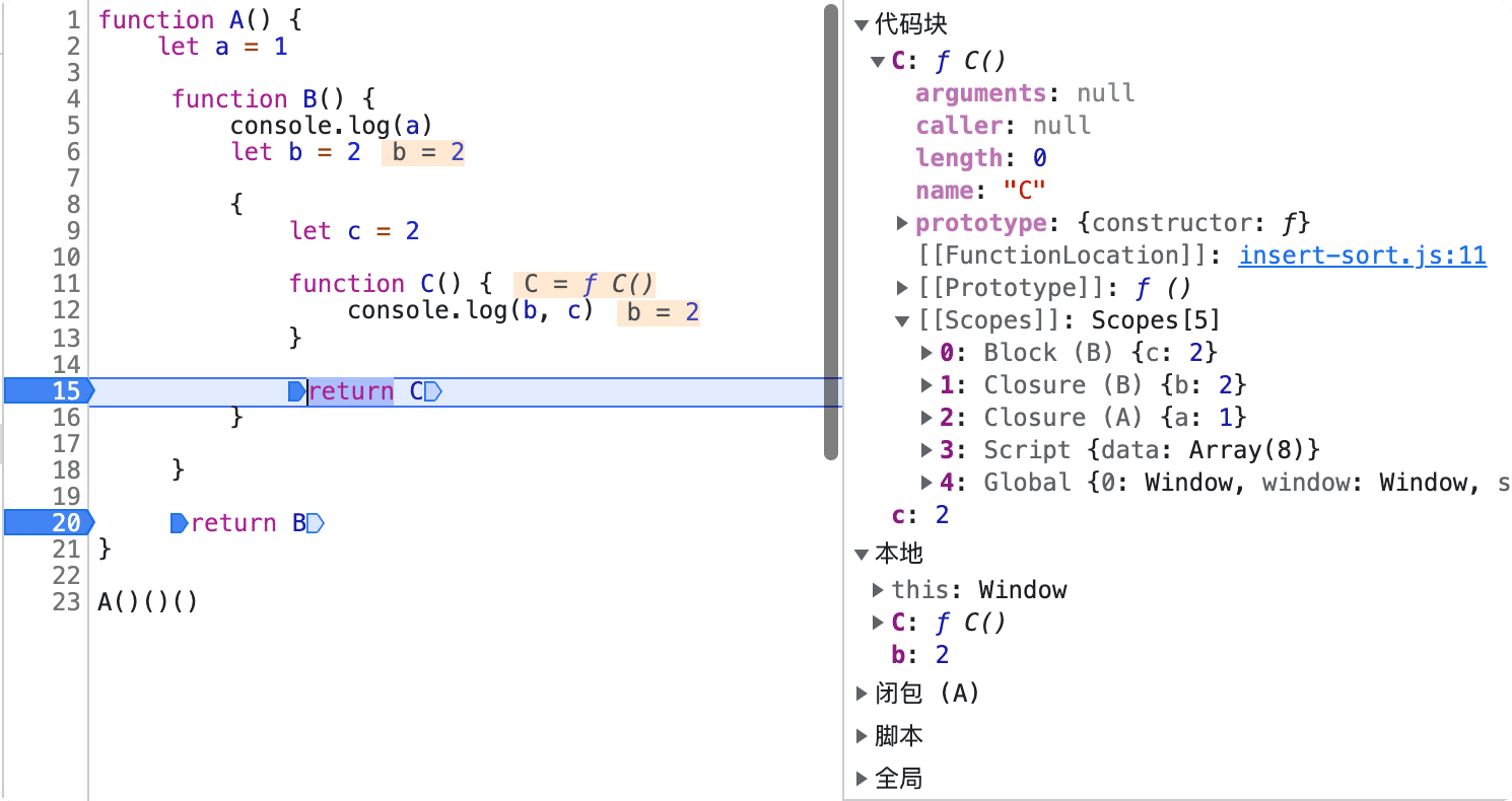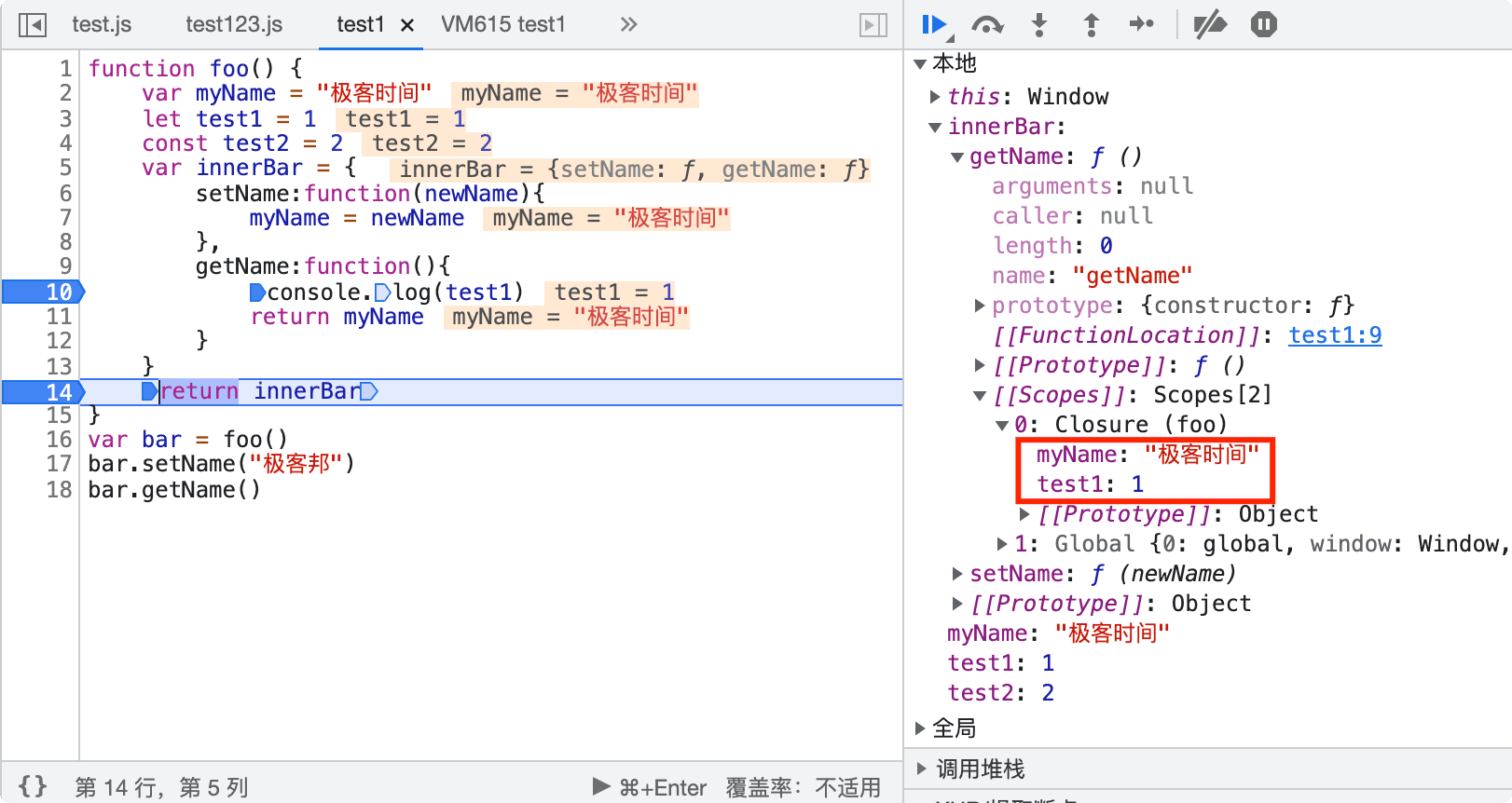 [[scopes]]对象中。这时候堆中的[[scopes]]对象中就包含了 myName 和 test1 两个变量了。 - 由于 test2 并没有被内部函数引用,所以 test2 依然保存在调用栈中,当调用结束,test2 也就会被销毁。