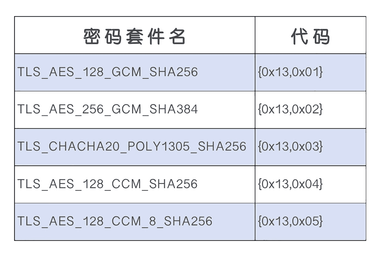 TLS1.3 废除了很多有漏洞、加密弱的加密算法,这样简化了密码套件列表: