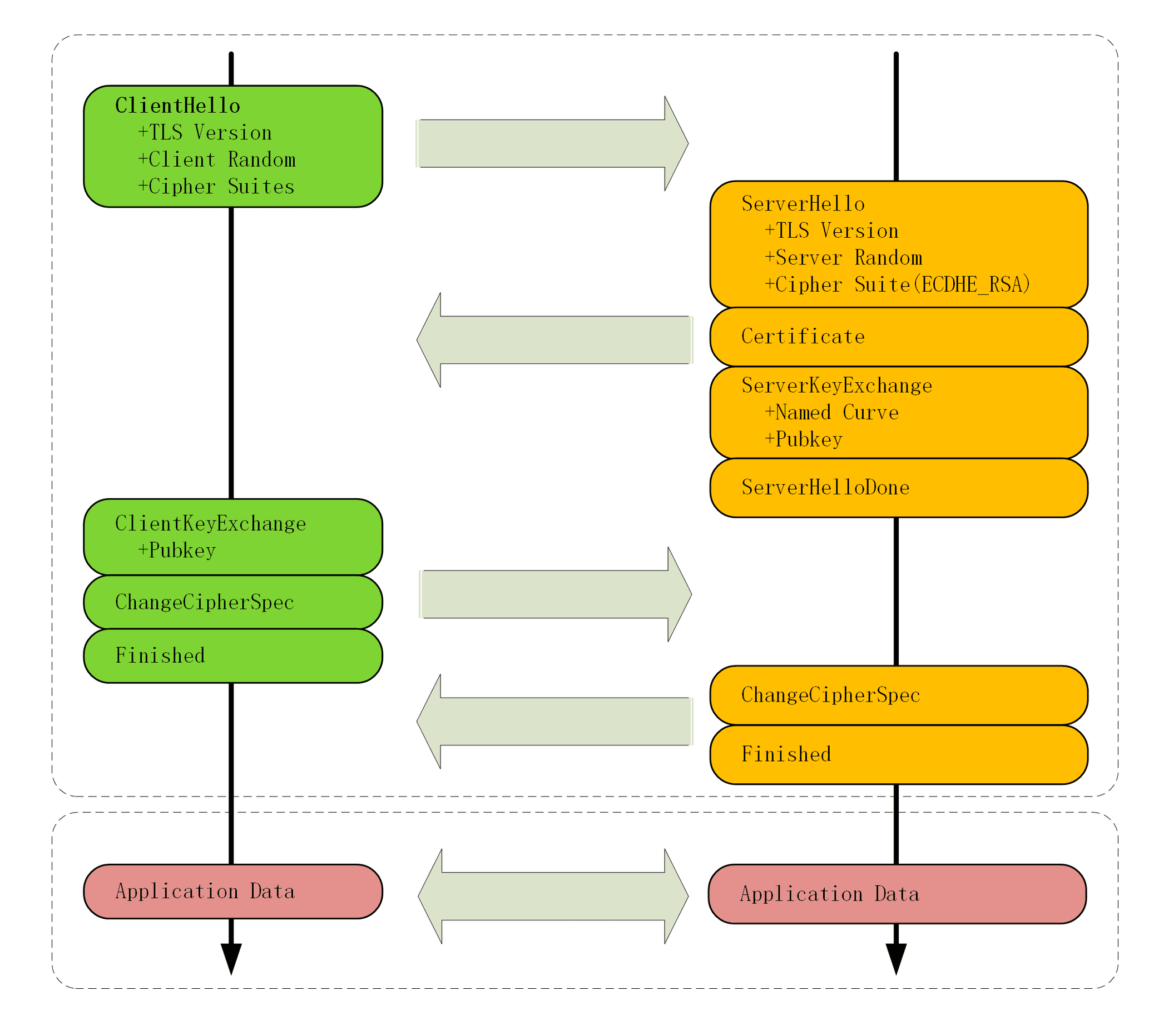 - 客户端生成对称加密的密钥,用服务度公钥加密传送给服务端