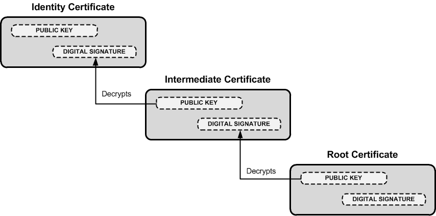因此,每个根 CA 机构都维护了一个树状结构,一个根 CA 下面包含多个中间 CA,而中间 CA 又可以包含多个中间 CA。这样就形成了一个证书链,你可以沿着证书链从用户证书追溯到根证书。