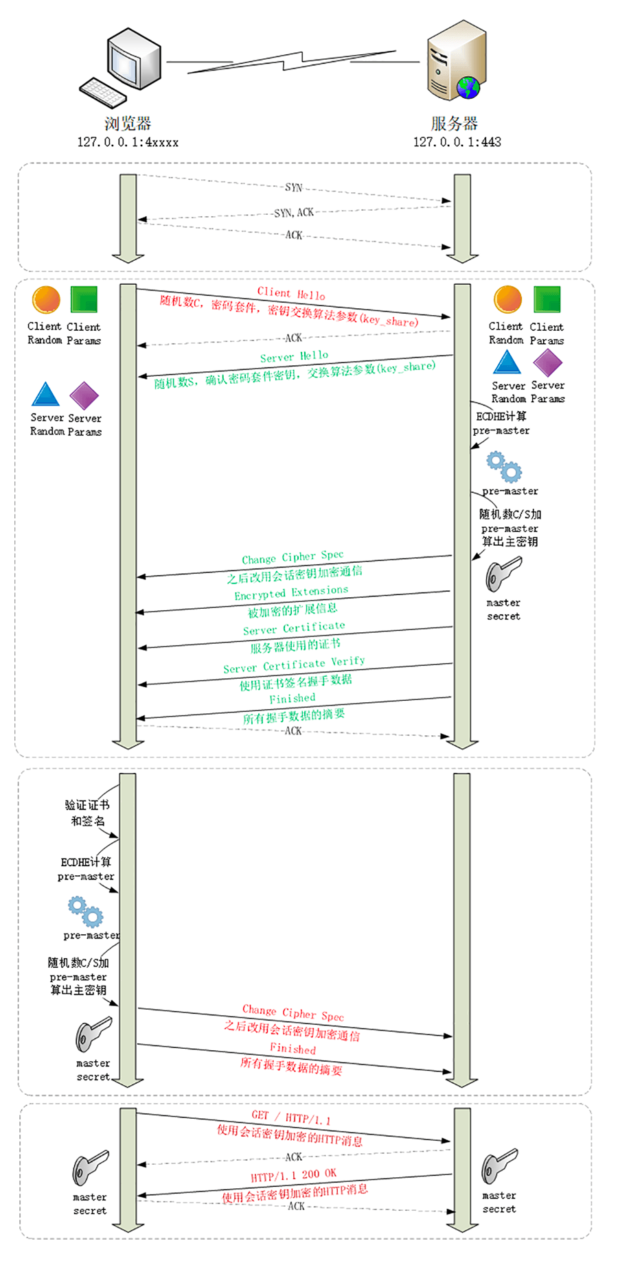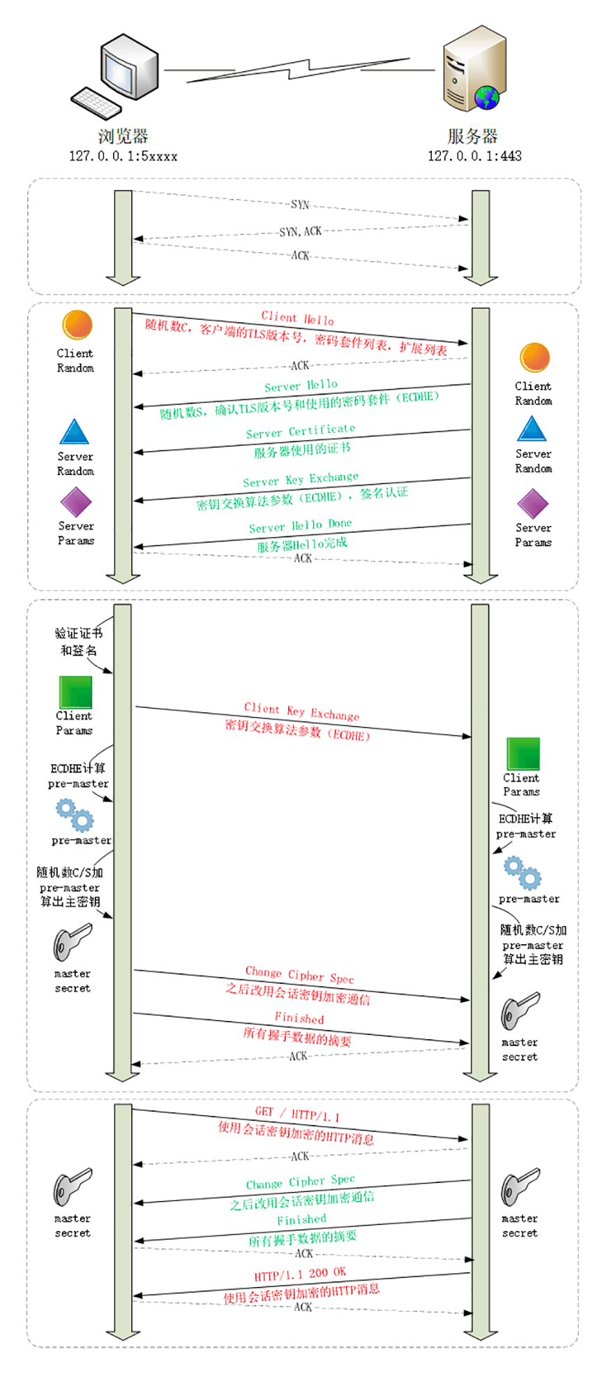 - 客户端和服务器可以根据 Client Params、Server Params 用 ECDHE 算法计算出 Pre-Master 随机数,然后使用 Client Random、Server Random 和 Pre-Master 生成会话密钥的主密 Master Secret