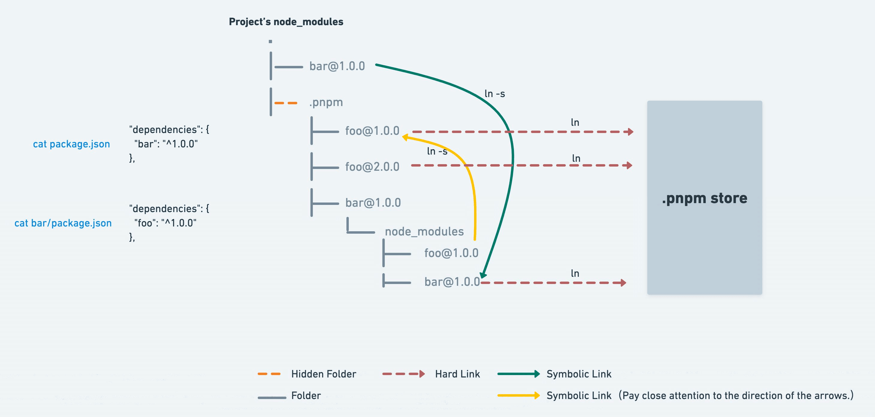 .pnpm内,并基于符号链接的 node_modules 结构,通过符号链接来连接依赖关系 - 所有的包通过硬链接到 store 内部真实文件位置