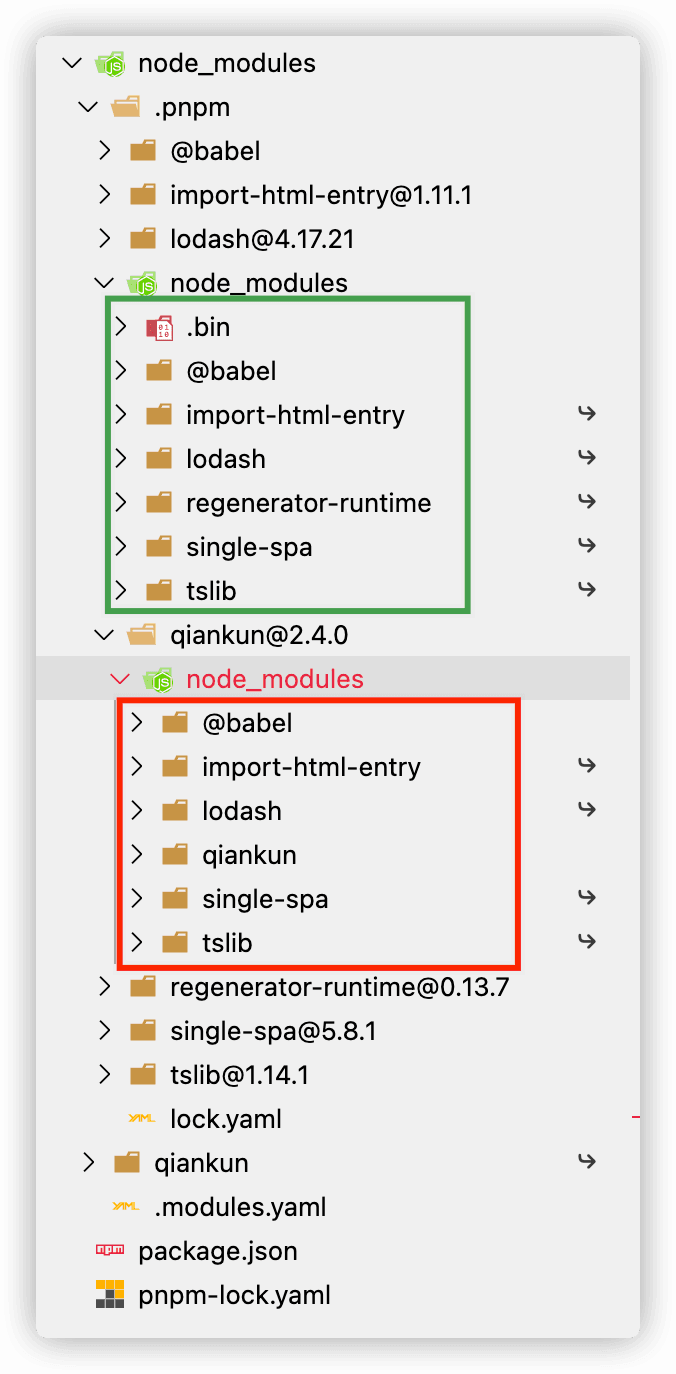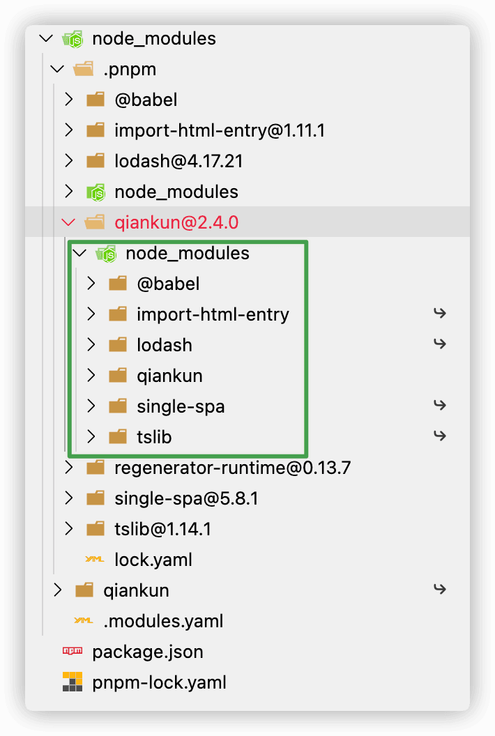 - 除了 qiankun 是硬链接到全局真实存储的文件,其他依赖项都是继续符号链接到 .pnpm 下的包