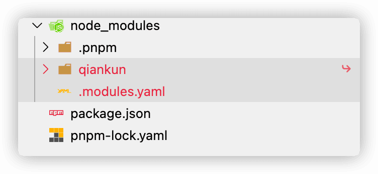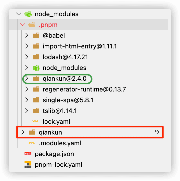 - qiankun 只是个软链接,解析模块时,Node 会解析符号链接,寻找符号链接原本的位置,即