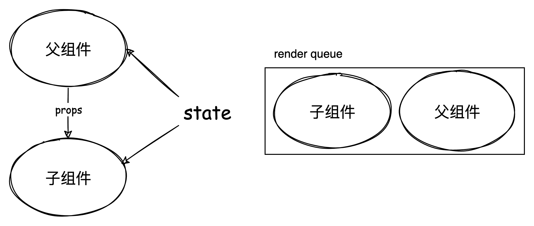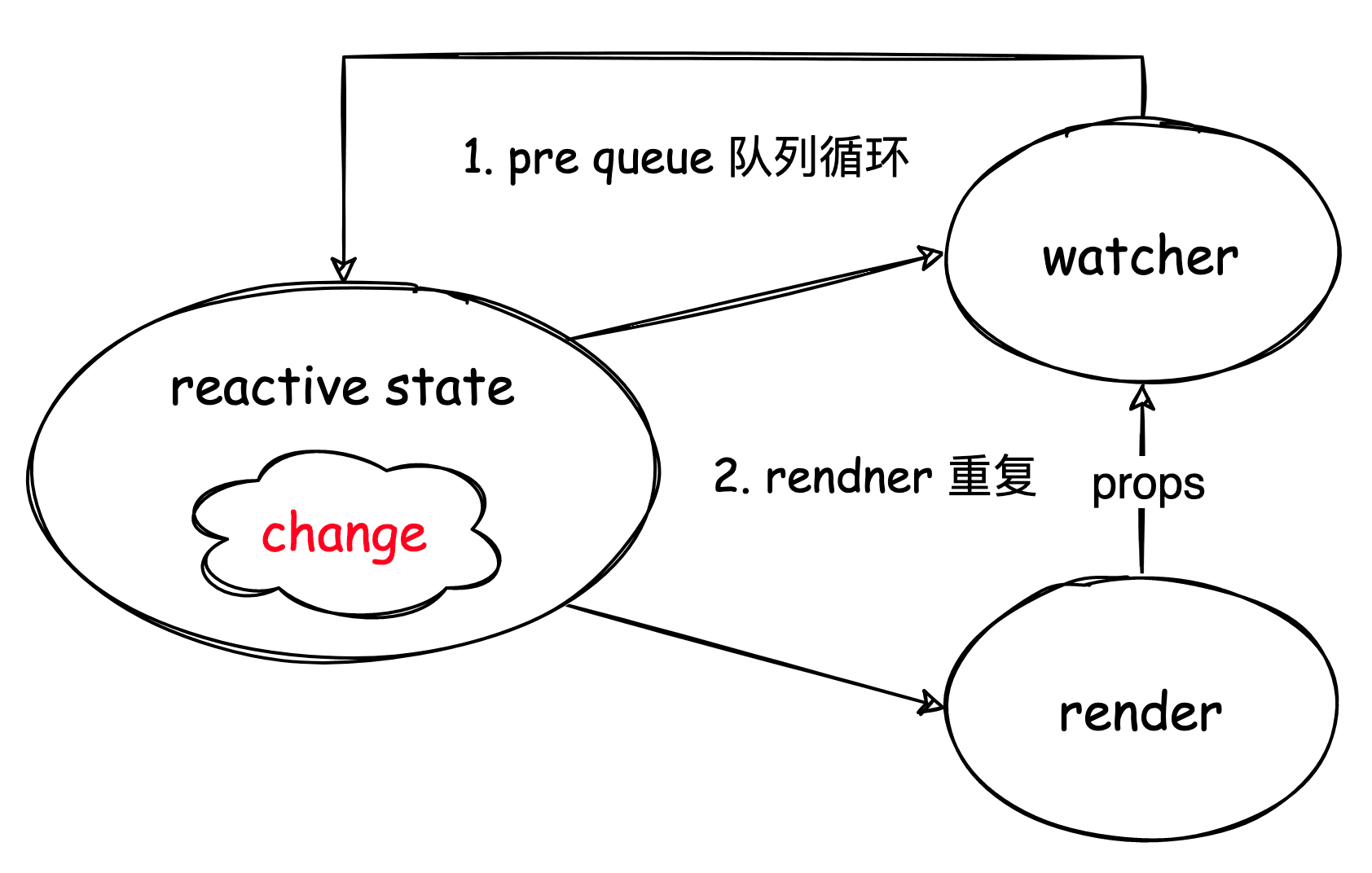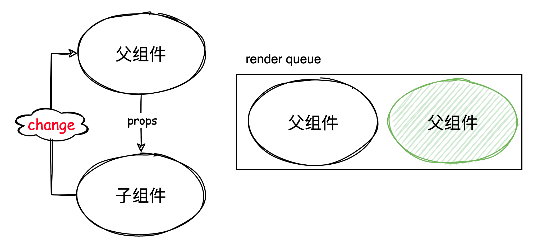 在执行 render 任务时,这时 props 的改变可能会触发子组件的 watcher,在渲染子组件前同样必须先清空 pre queue。同时要注意防止往 render queue 中插入子 render 任务,因为当前的 render 任务包含了子 render 任务要执行。
