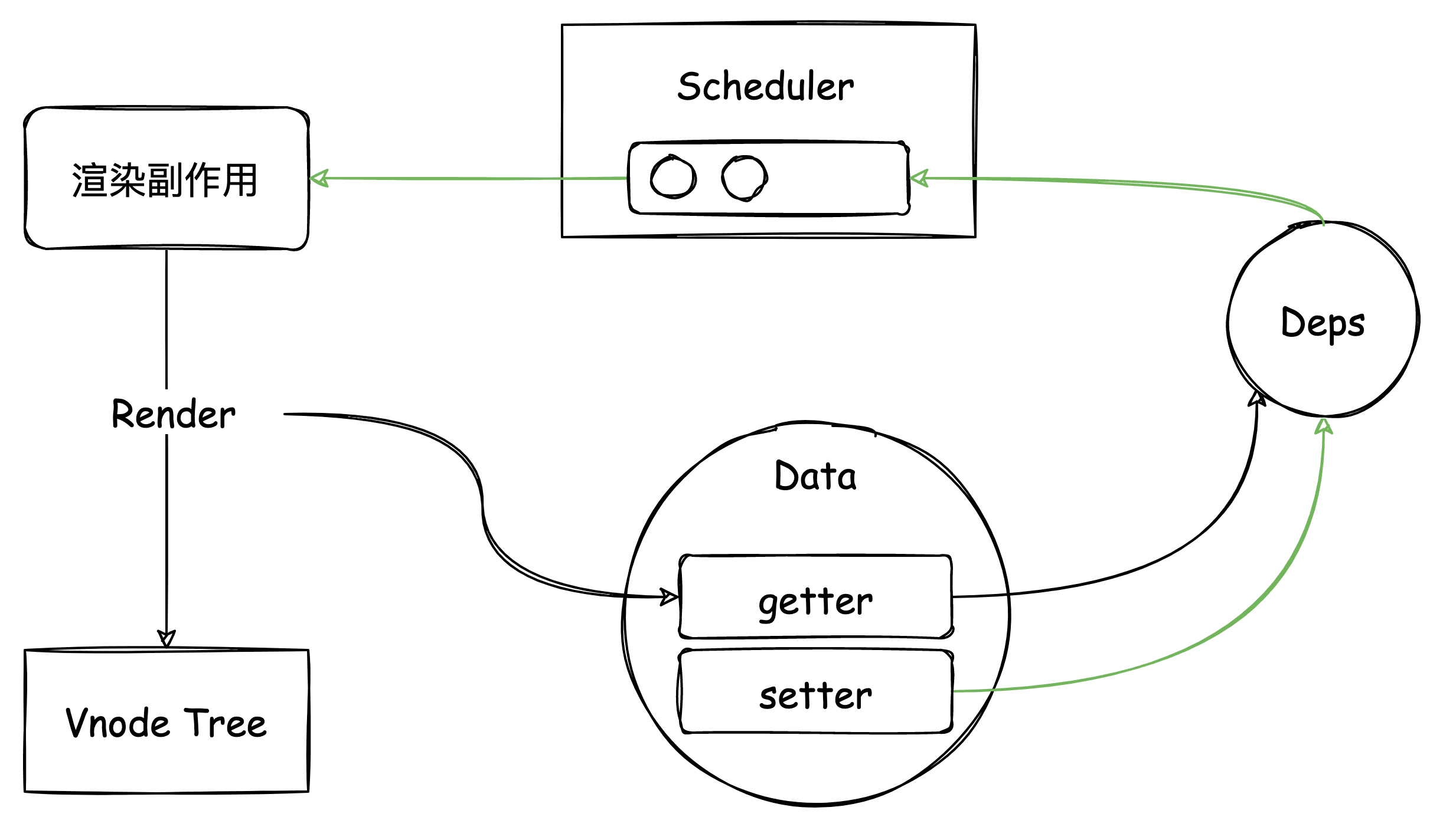 - 响应式渲染机制:将组件渲染封装成渲染副作用,收集响应式依赖,异步调度更新。