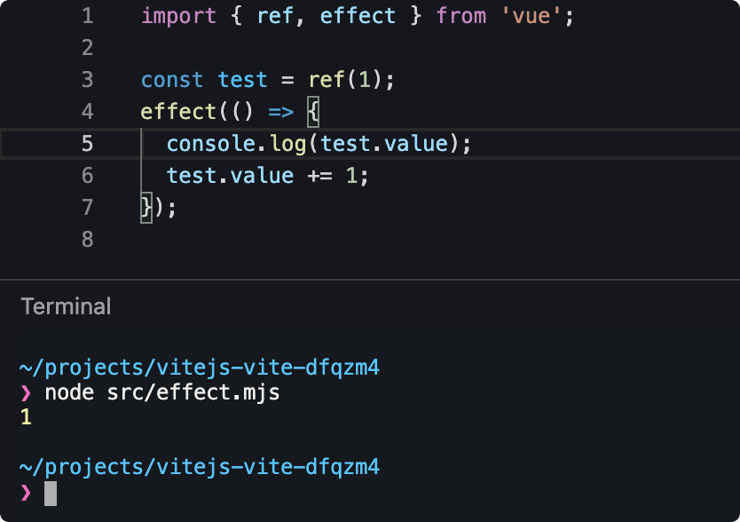 下面例子中,effect 中修改 test 值,但副作用只执行了一次。