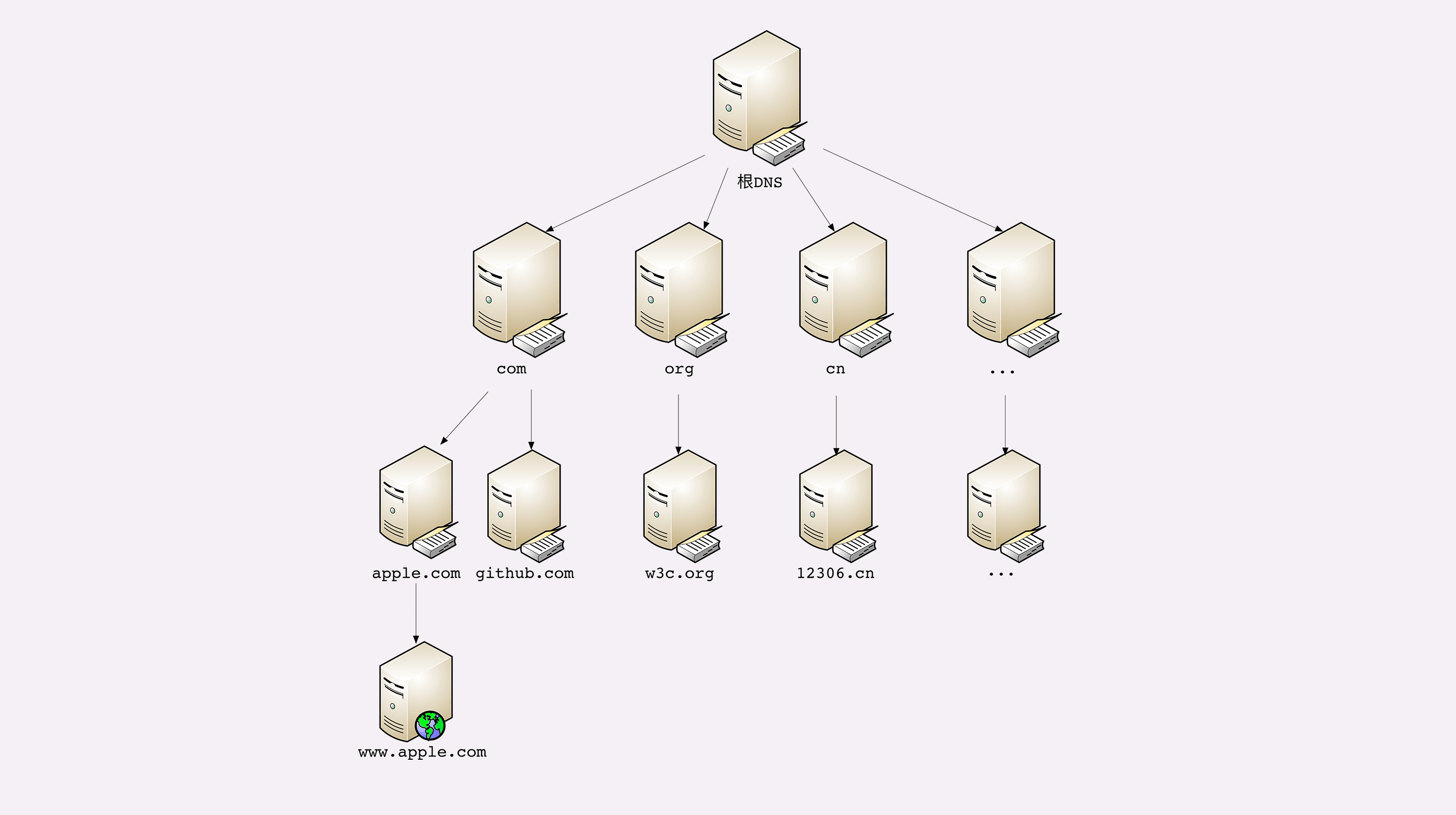 - 顶级域名服务器(Top-level DNS Server):管理各自域名下的权威域名服务器,比如 com 顶级域名服务器可以返回 apple.com 域名服务器的 IP 地址;
