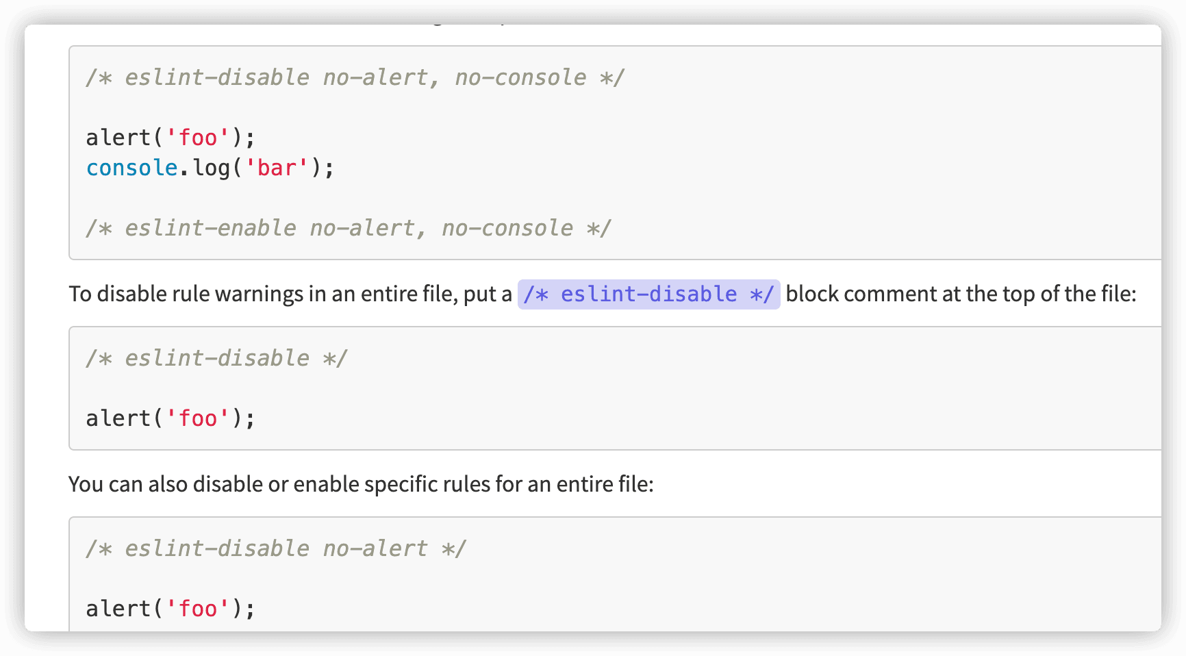 或者使用 eslint-disabled 代码注释去跳过某些规则