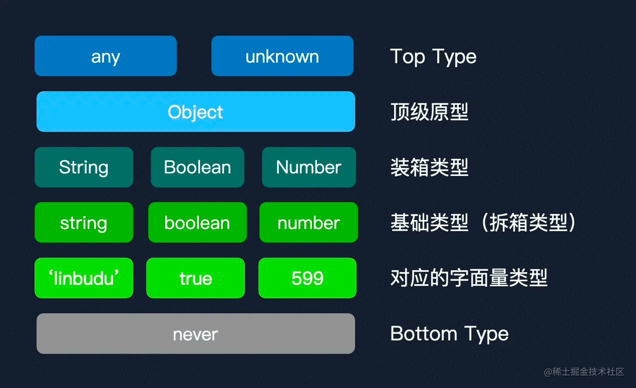 - Object:包含了下层所有的类型(TypeScript 继承 JavaScript 设计:Object 是原型链顶端)