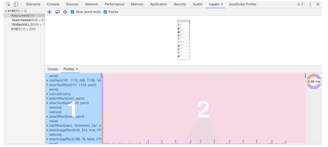 可以打开“开发者工具”的“Layers”标签,选择“document”层,来实际体验下绘制列表,如下图所示: