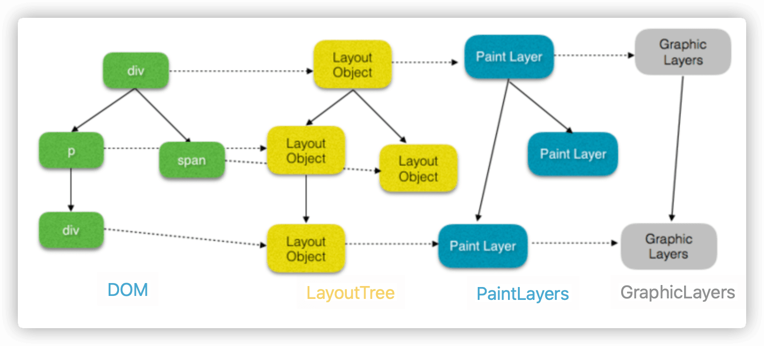 上图中从 DOM 到最终 Graphic Layer(图层)的转换并不是一对一,只有具有特定样式的节点会被转换为单独的图层,如果一个节点没有对应的层,那么这个节点就从属于父节点的图层,比如 span 节点还是属于 div 图层。