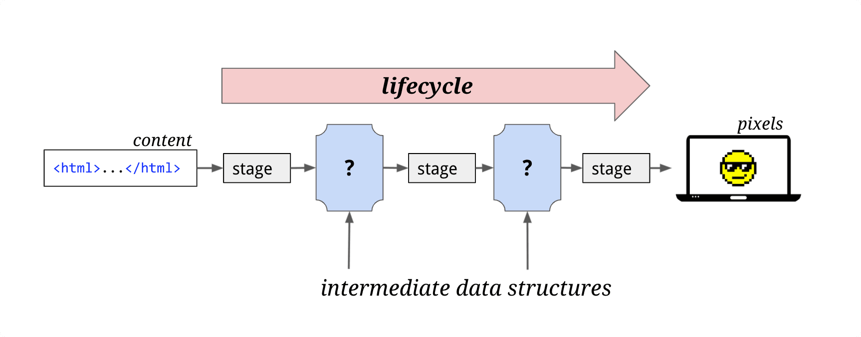一个页面形成需要经过多个流程阶段,我们把这样的一个处理流程叫做渲染流水线或者渲染管道。为了提高渲染效率,整个渲染渲染流程就像是一条管道,分成多个渲染阶段,每个阶段都会产生中间产物,当发生更新时,就可以从某一阶段的产物复用开始,这样即提高渲染效率并且分多阶段任务执行,可以降低系统复杂度,提高任务调度灵活性。