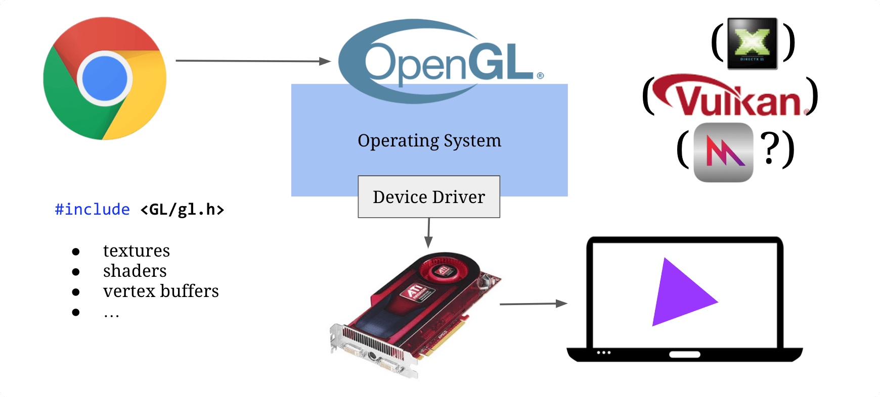 管道的最终是将 Web 内容转换成底层操作系统提供的图形库调用操作,去驱动显卡生成页面像素,在多平台的今天,有标准 API 图形库 OpenGL,但在 window 平台,还需要额外转换成 DirectX API 调用,未来还将实现更多图形库支持,如 vulkan。